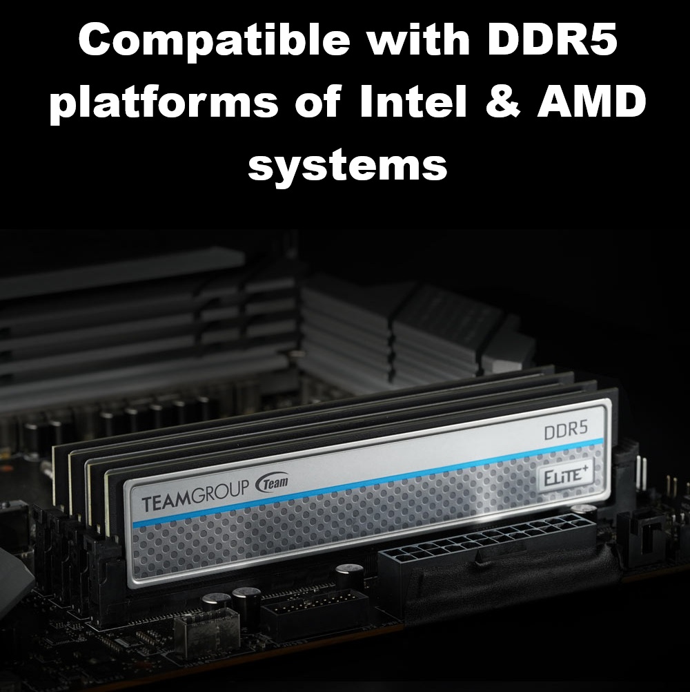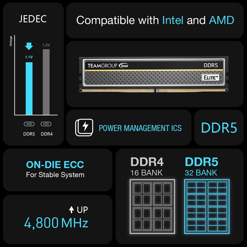 TeamGroup ELITE PLUS 32GB DDR5 5600MHz Desktop Memory Kit (2x16GB) CL46 With Aluminum Heat Sink, On-Die ECC, 1.1V Low Voltage, Intel XMP & AMD EXPO Support | BLACK