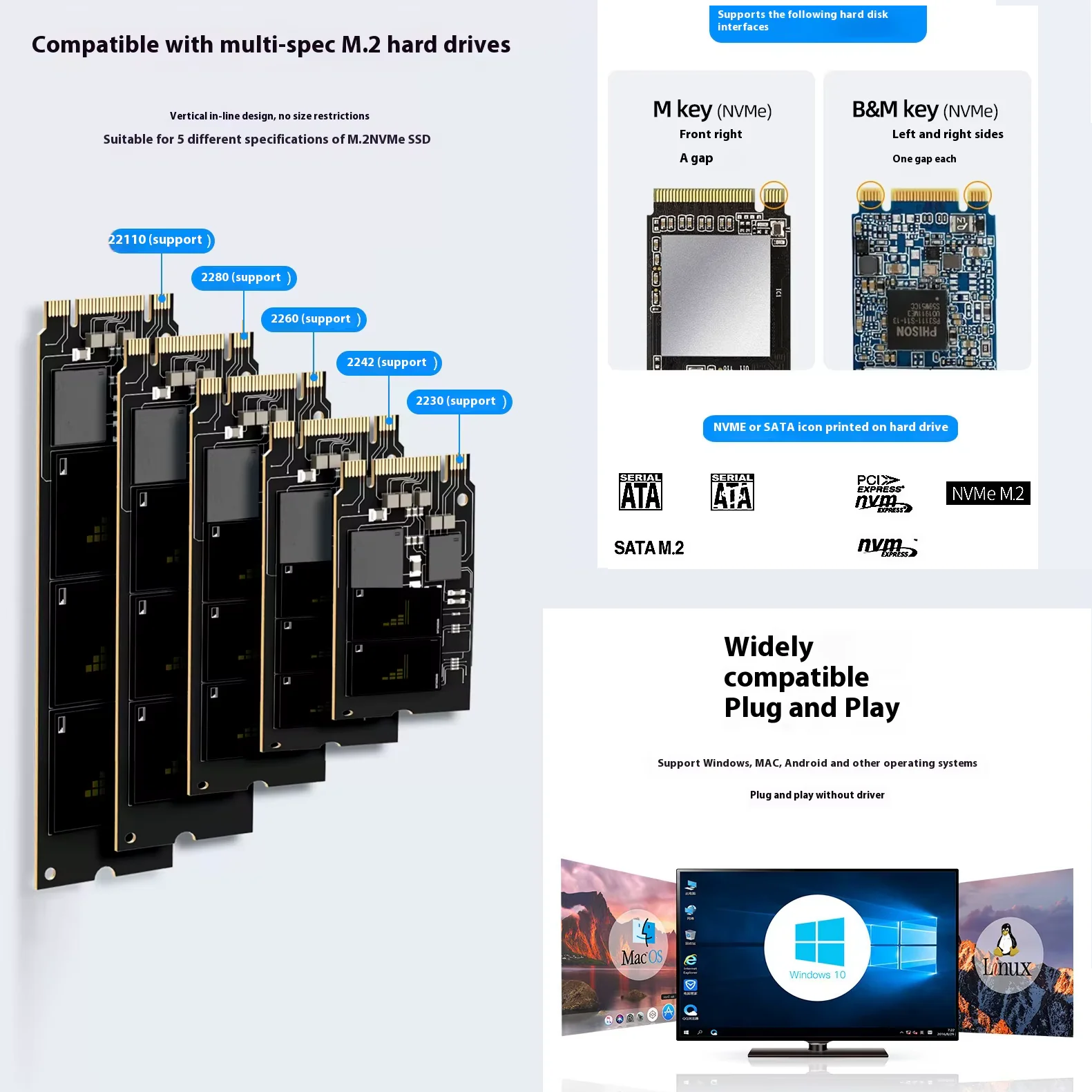 - Dual Protocol Support (NVMe & SATA) : Compatible with both NVMe (PCIe) and SATA M.2 SSDs via M-Key and B&M Key interfaces.