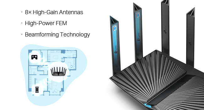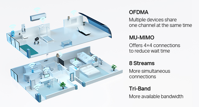 - More Devices with Less Lag: OFDMA and MU-MIMO technology deliver data to multiple devices, simultaneously. Eight high-gain antennas equipped with Beamforming ensure vast coverage