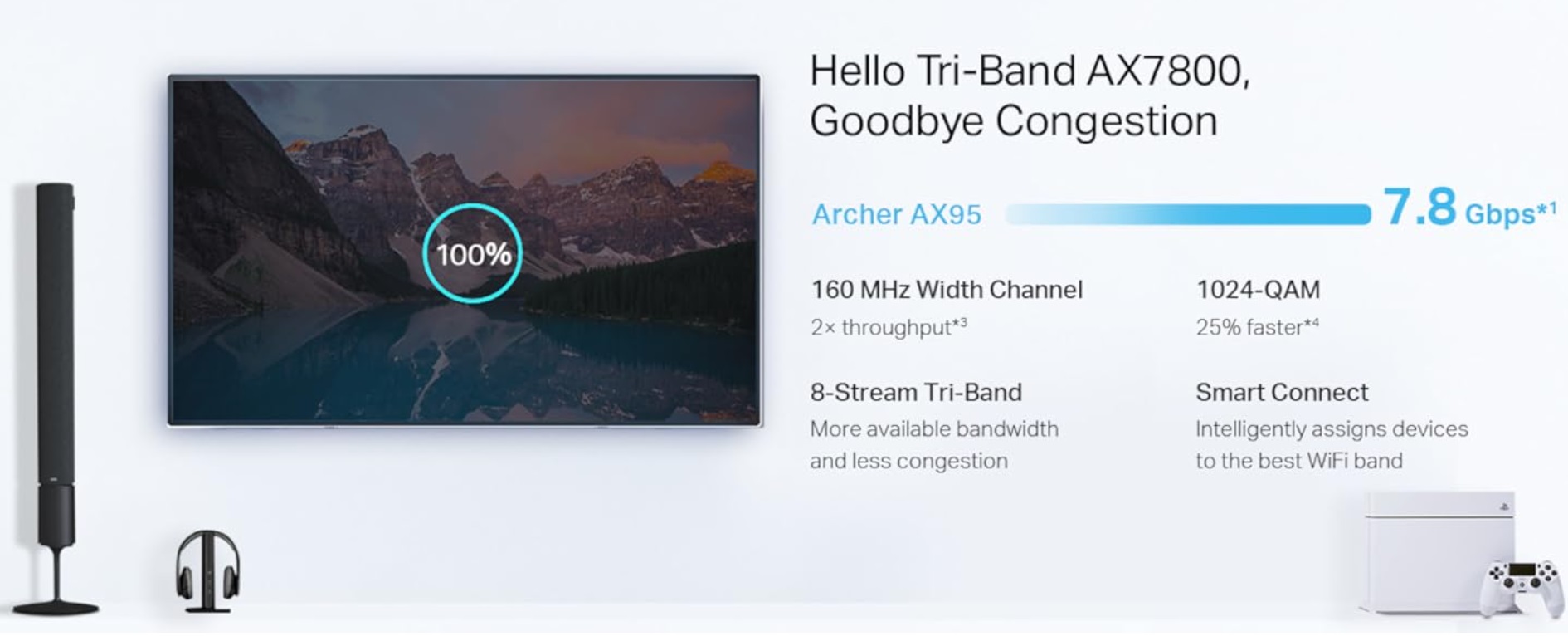 - Faster Tri-Band AX7800 Wi-Fi 6: Up to 7.8 Gbps (4804 Mbps + 2402 Mbps + 574 Mbps) Wi-Fi for faster browsing, streaming, and downloading, all at the same time