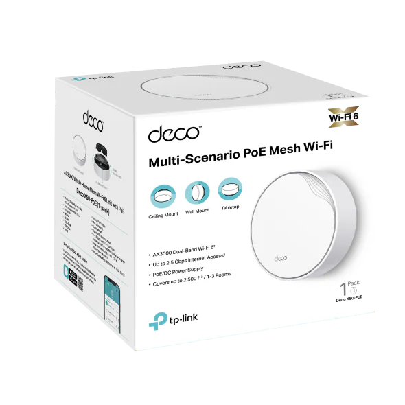 TP-Link Deco X50-PoE AX3000 Mesh WiFi 6 System (3-Pack) – 2.5 Gbps Multi-Gig Port, PoE Support, Ceiling/Wall Mountable, AI-Driven Mesh, HomeShield Security & App Setup