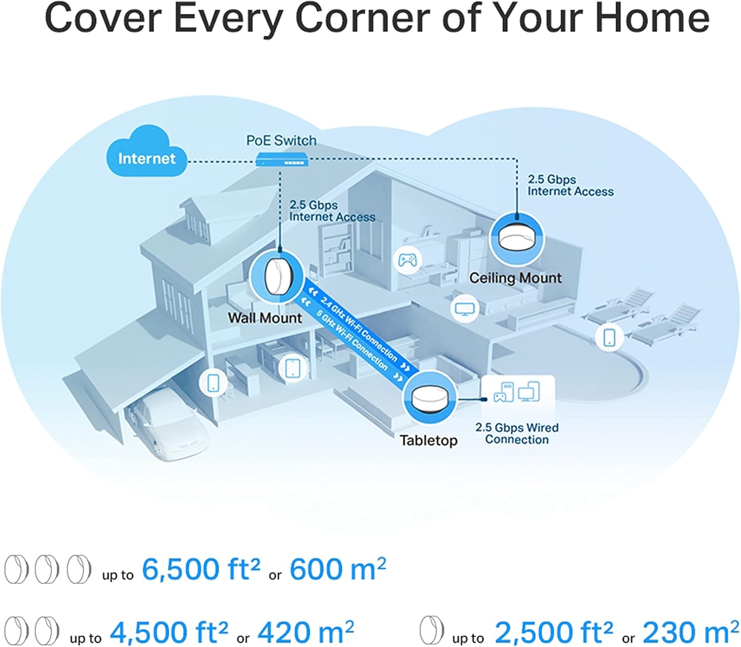 - Full-Home Coverage: Covers up to 6,500 ft² / 600 m² (3-pack) and supports 150+ devices simultaneously — perfect for smart homes, offices, and entertainment zones.