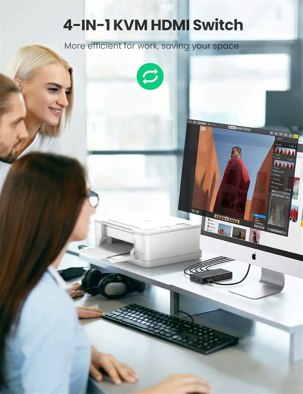 UGREEN 4×1 HDMI KVM Switch Box | 4K@60Hz Ultra HD | USB Keyboard & Mouse Sharing | 3 Switching Modes | Wide Compatibility with PC, Mac, Consoles