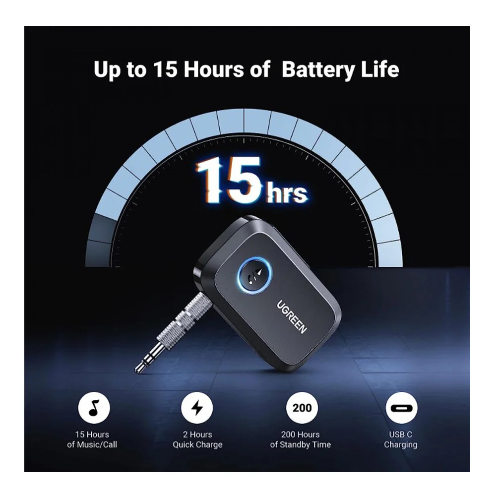 UGREEN Bluetooth 5.3 AUX Adapter With 15H Battery, Hands-Free Calling, Dual Device Pairing, Plug-And-Play 3.5mm Receiver for Car Stereo, Speakers, Headphones | Black