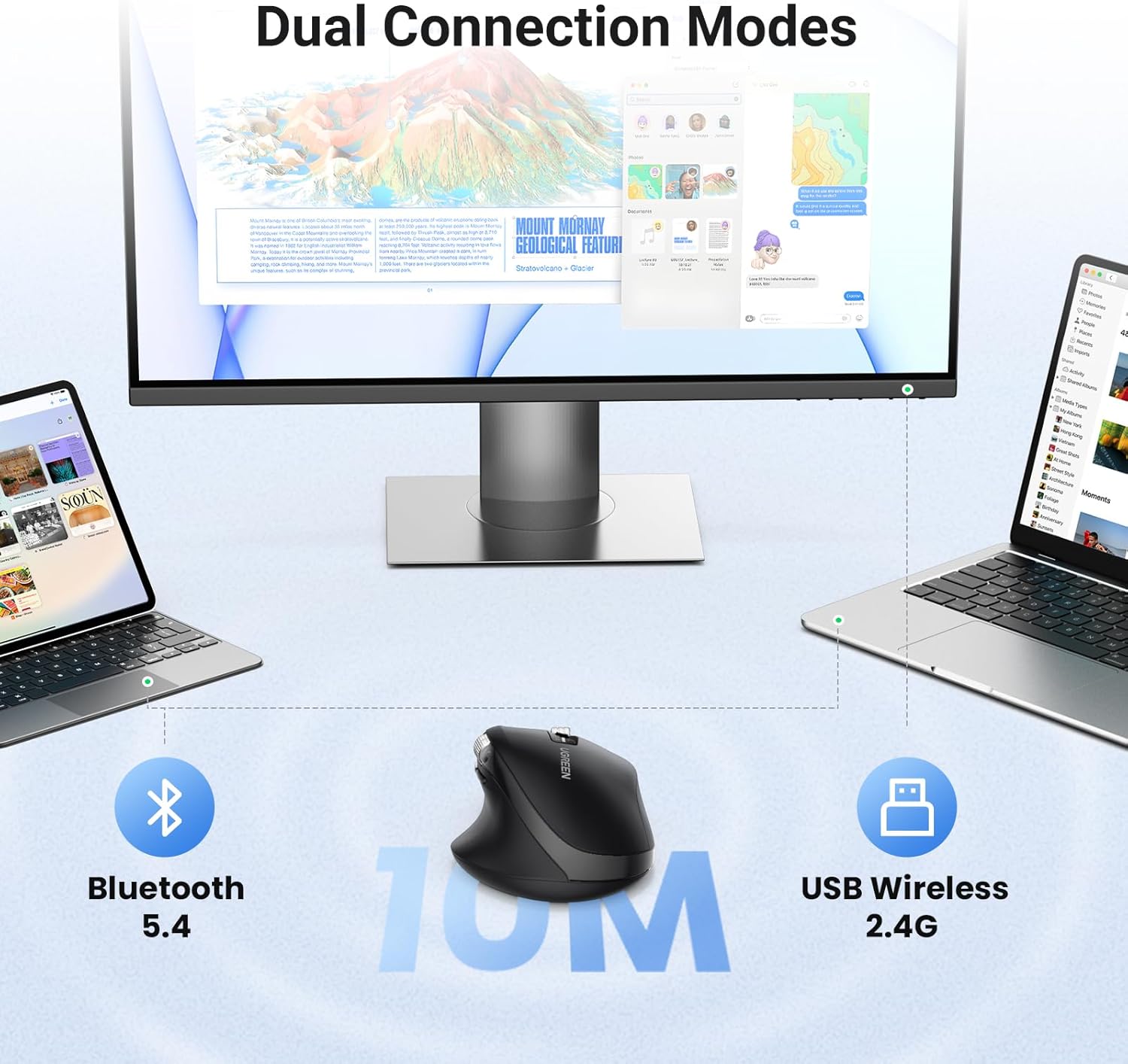 - Bluetooth & 2.4G Dual Mode: This UGREEN wireless mouse supports two connection modes. You can freely choose between them, and it can connect to three devices simultaneously—two Bluetooth computers and one 2.4G device. You can easily switch between devices, and the connection distance is up to 10 meters.