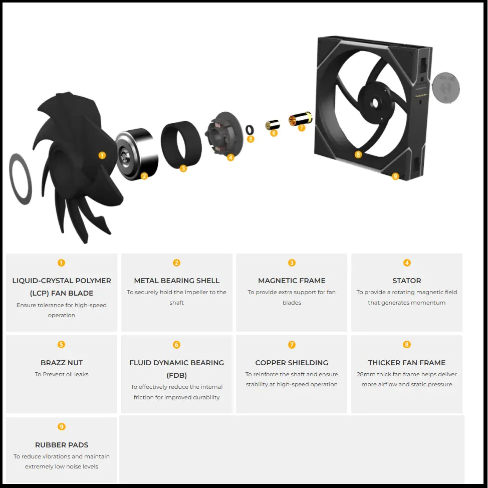 - LCP (liquid crystal polymer) fan blades are used for tight tolerance.