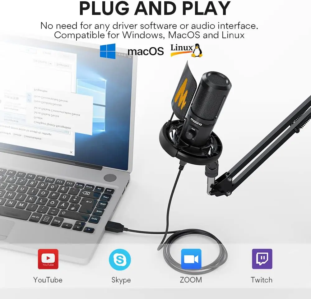 - Plug and Play: With a 1.5M USB 2.0 cable, this PC microphone does not require any additional driver software or external devices. It can be instantly recognized by Mac or Windows system. Plug it in and use it right away. The ease of use is ideal for beginners to start recording or streaming. NOTE: NOT compatible with Xbox.