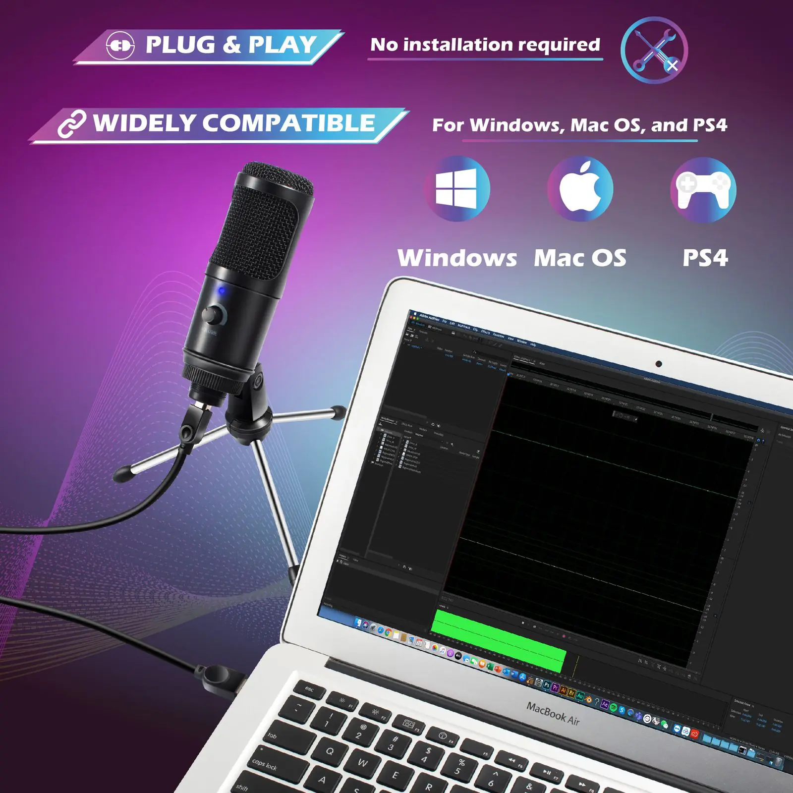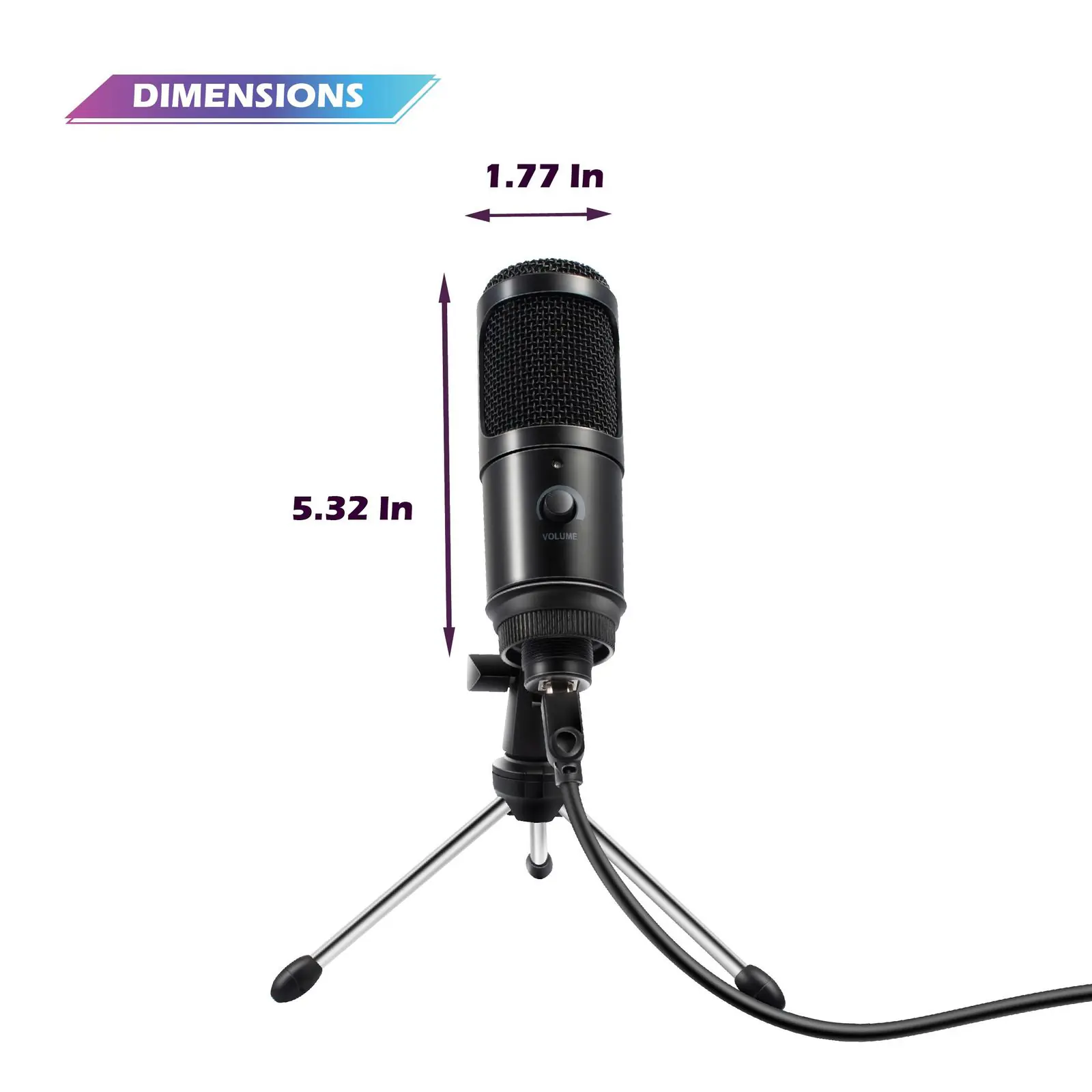- WIDE COMPATIBILITY: enables the microphone to work on Windows, Mac OS, and even PlayStation 4. Just plug and play, no installation required. Dimensions: 5.32” x 1.77”. USB Cable length: 48”