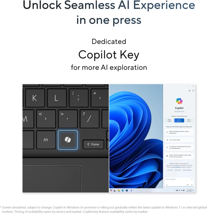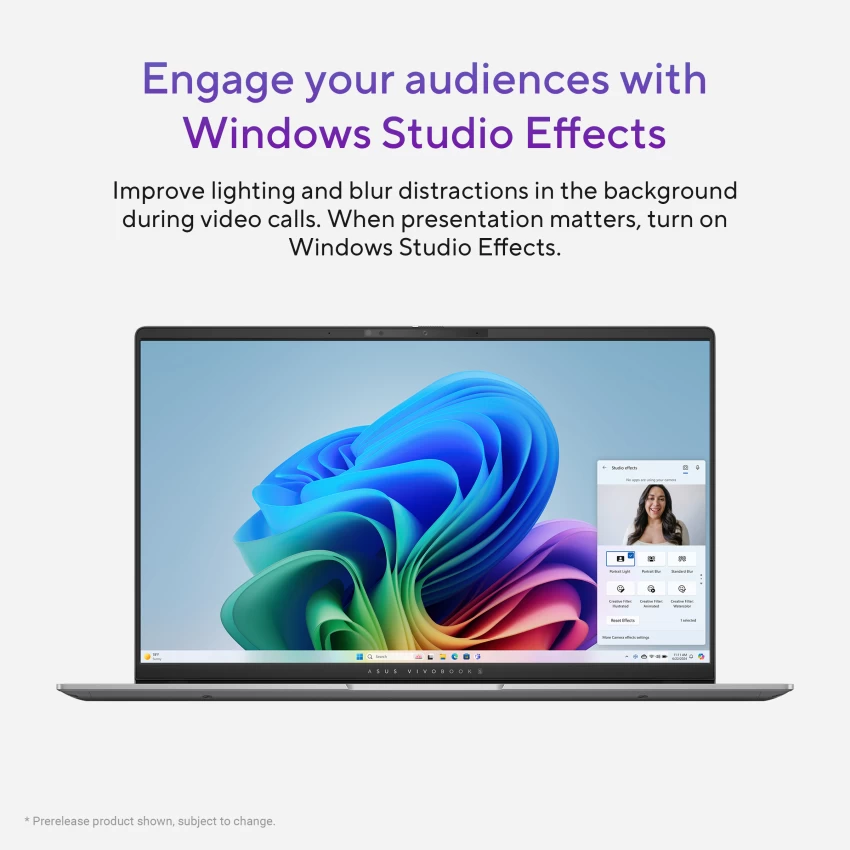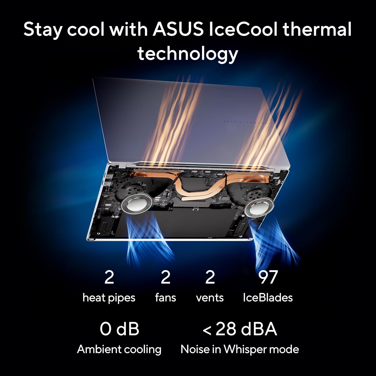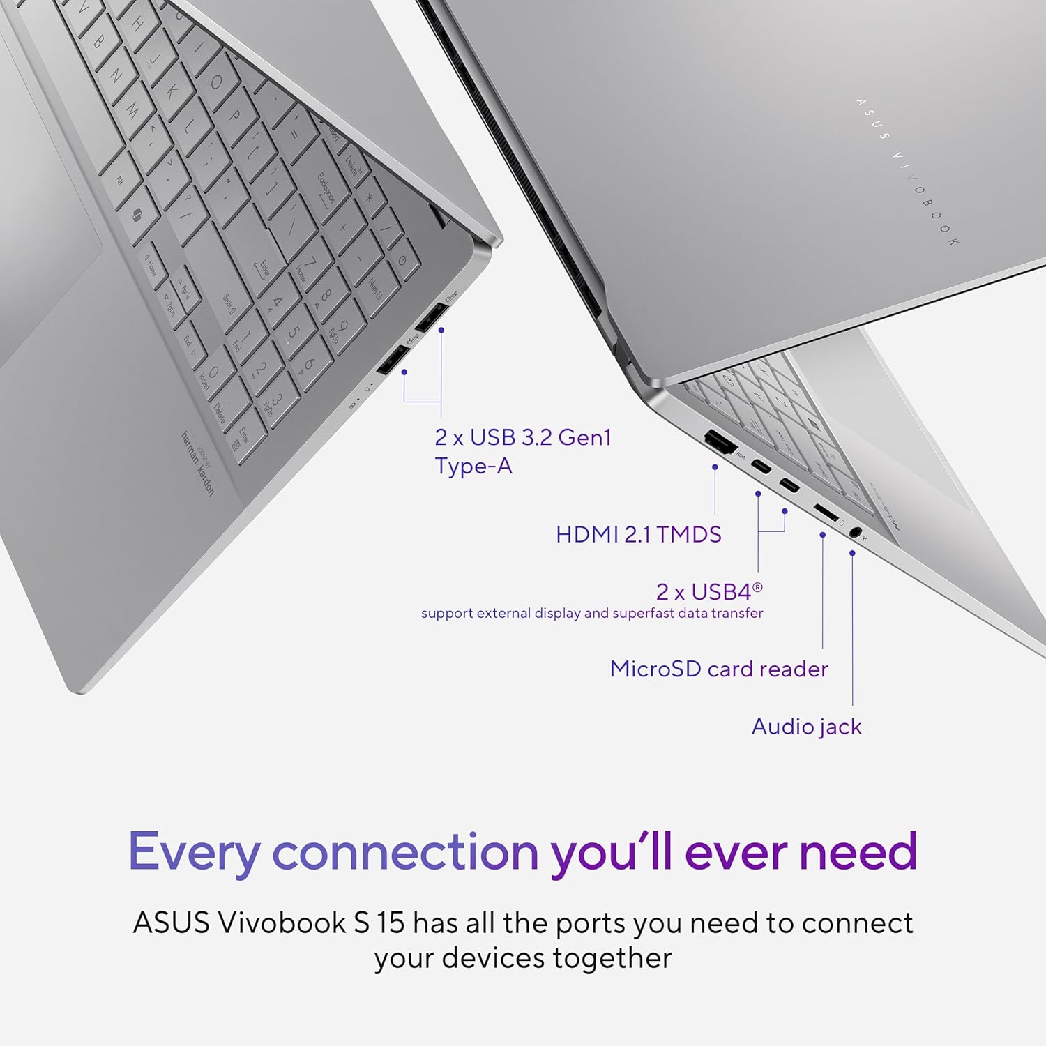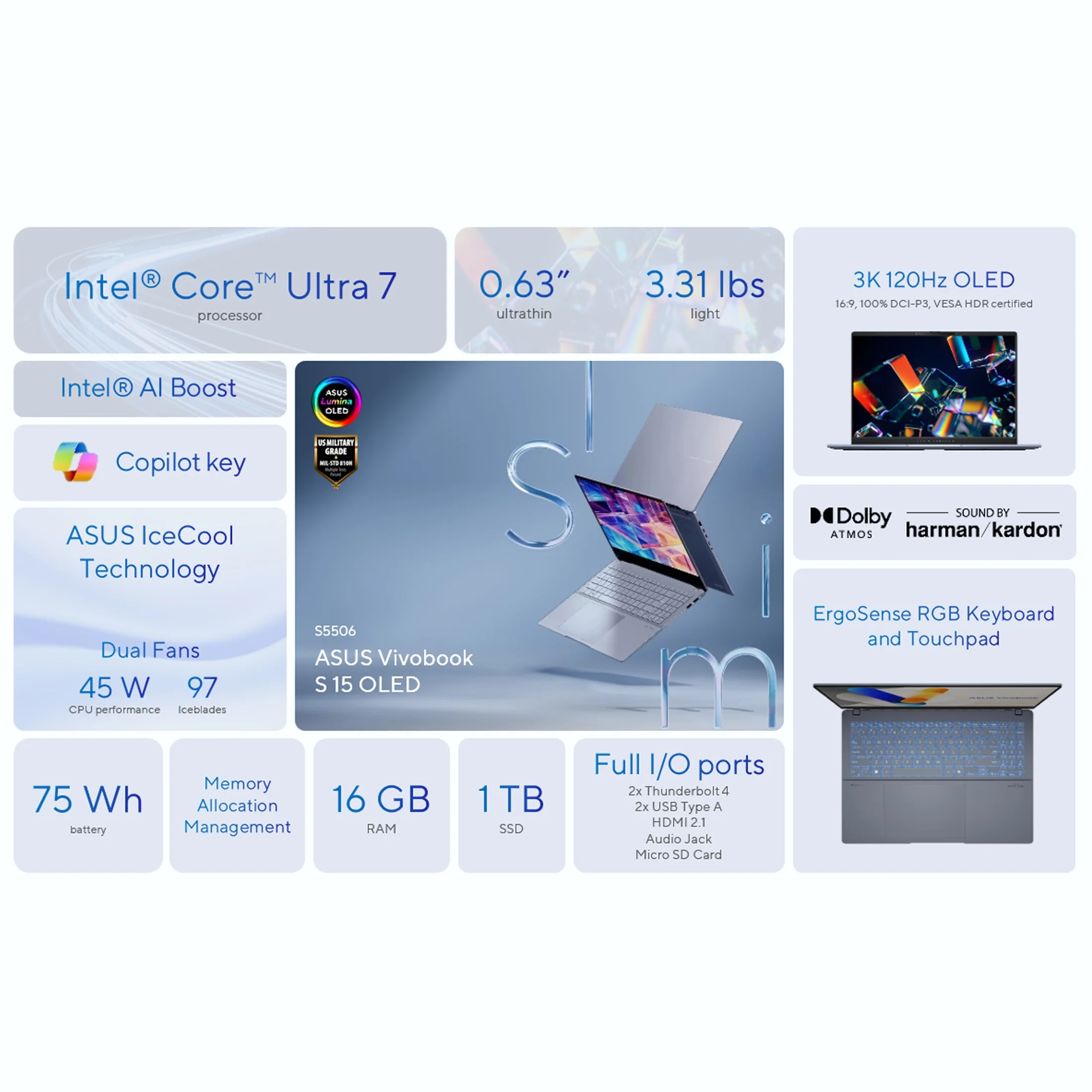 - The ASUS Vivobook S 15 OLED elevates your laptop encounter, harmoniously blending advanced technology with a clean, minimalist design at just 3.31 lbs. It showcases the power of the Intel® Core⢠Ultra 7 processor for exceptional performance, a dedicated Copilot key for more AI exploration, a substantial 16-hour battery life, and a captivating 3K ASUS Lumina OLED screen. It also includes a 180° hinge, ergonomically designed keyboard with vibrant RGB backlighting, a bigger touchpad and an ASUS AiSense camera. This laptop is the perfect companion for modern life.