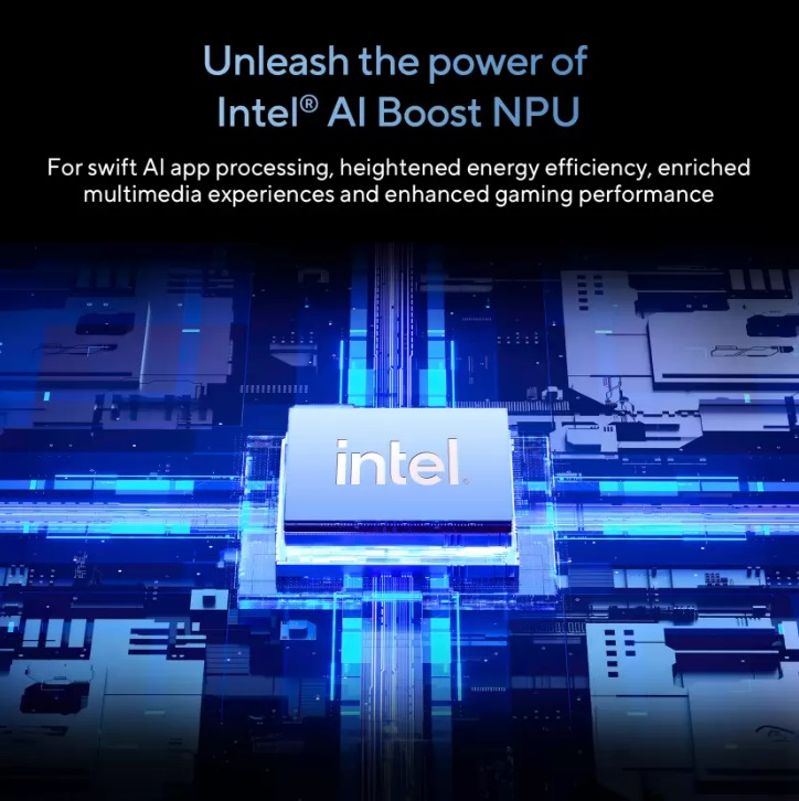 | Processor Type | Intel® Core⢠Ultra 7 Processor 155H 1.4 GHz (24MB Cache, up to 4.8 GHz, 16 cores, 22 Threads) Intel® AI Boost NPU |