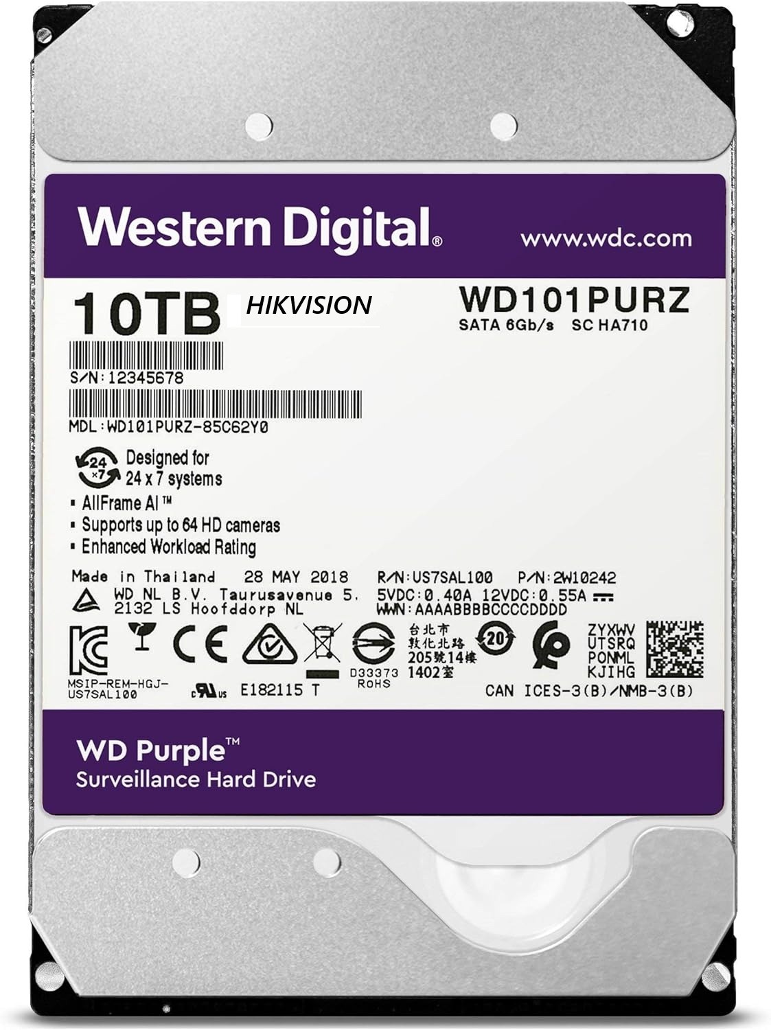Western Digital 10TB WD Purple Surveillance HDD | 3.5” SATA 6Gb/s | 256MB Cache | Mechanical Drive | Optimized for AI Hikvision & Mainstream Surveillance