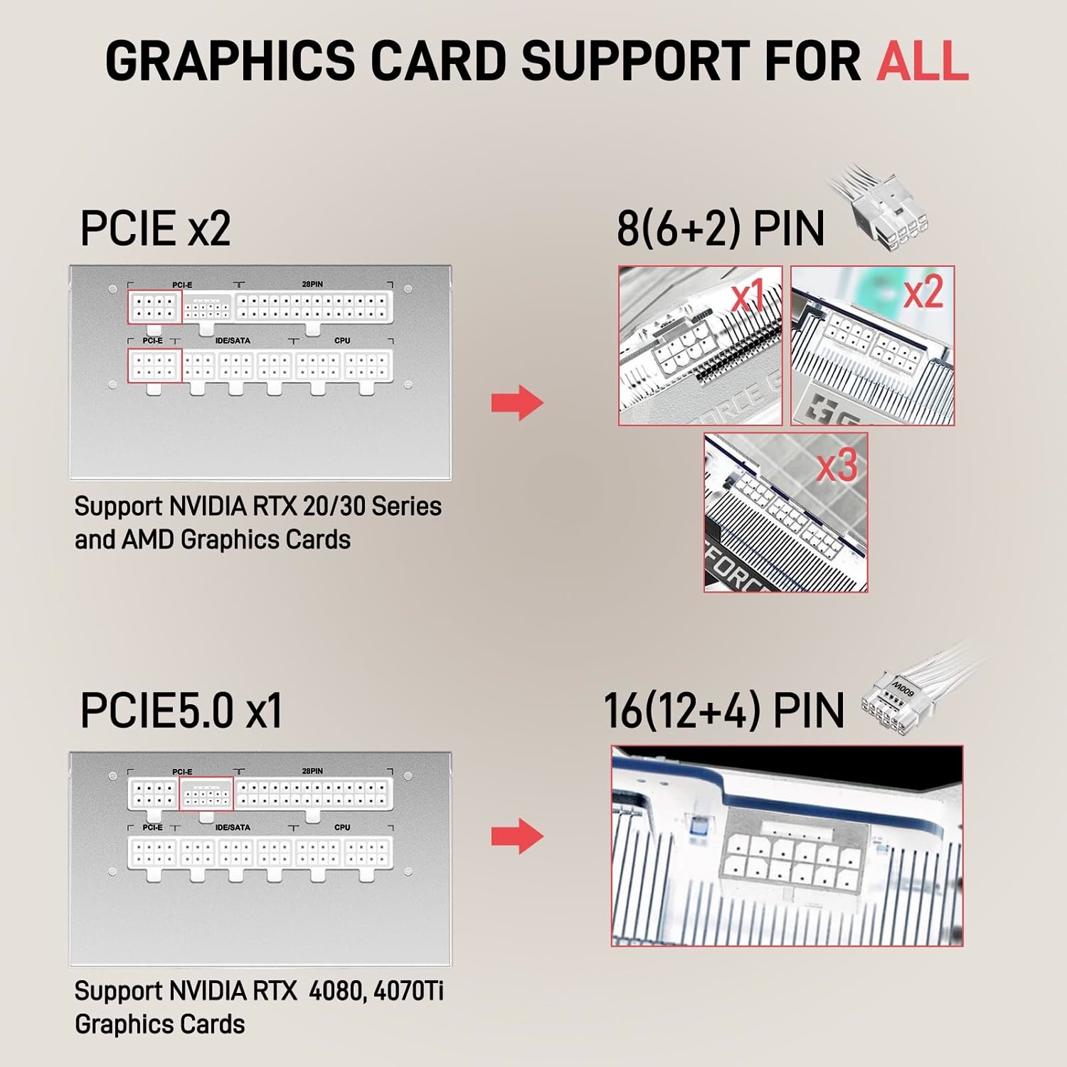 - Graphics Cards Support: It comes with 2x PCIE 4.0 ports support NVIDIA RTX 20/30 Series and AMD graphics cards, 1x PCIE 5.0 port support NVIDIA 4080/4070Ti graphics cards.