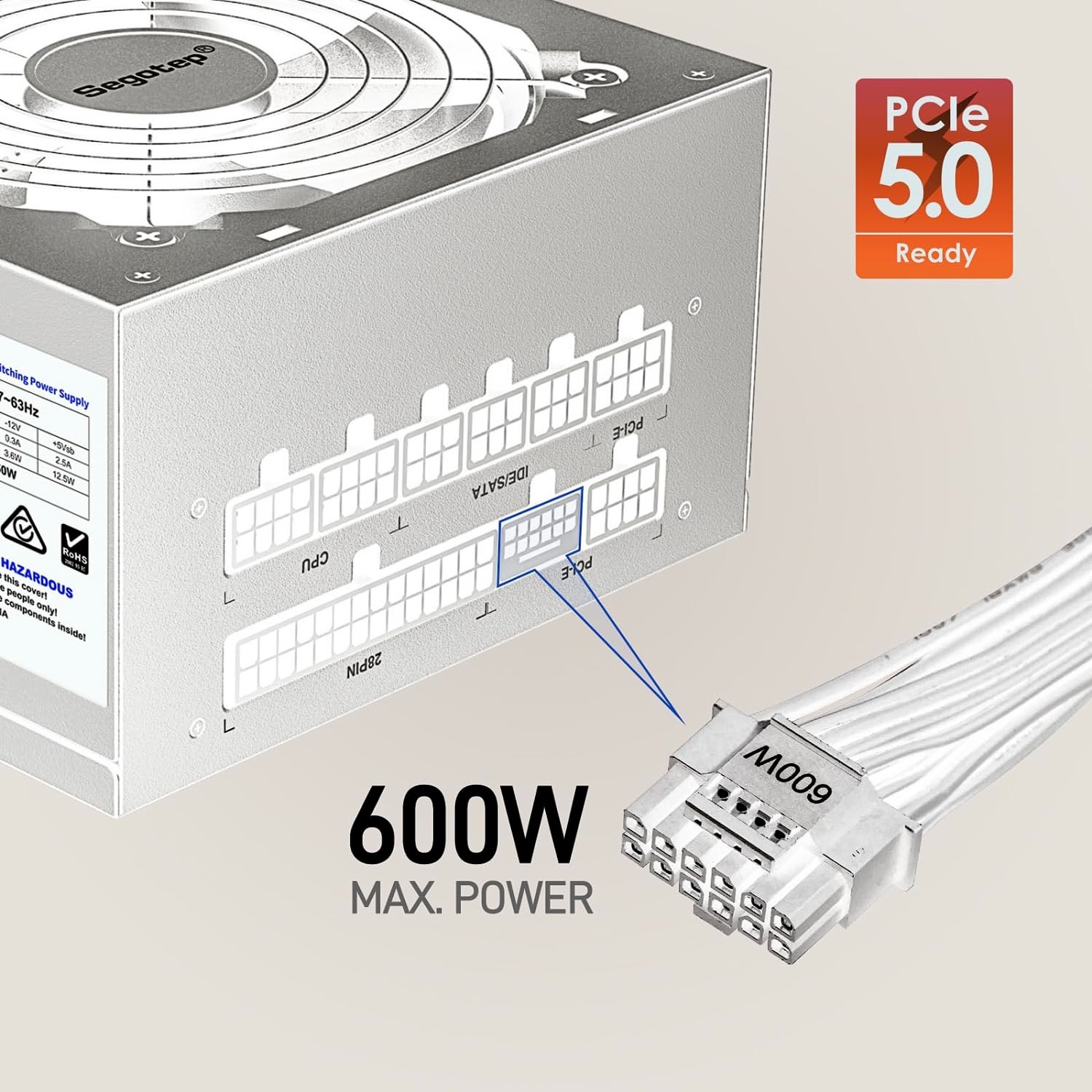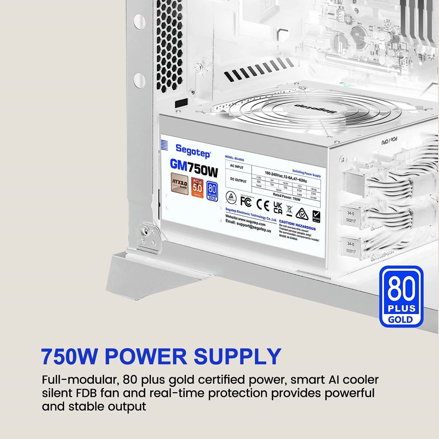 Segotep GM750W 750W Power Supply, 80 Plus Gold Full Modular PCIe 5.0 & ATX 3.0 Gaming PSU For NVIDIA RTX 20/30/40 Series & AMD GPU, 120mm Silent FDB Fan – WHITE