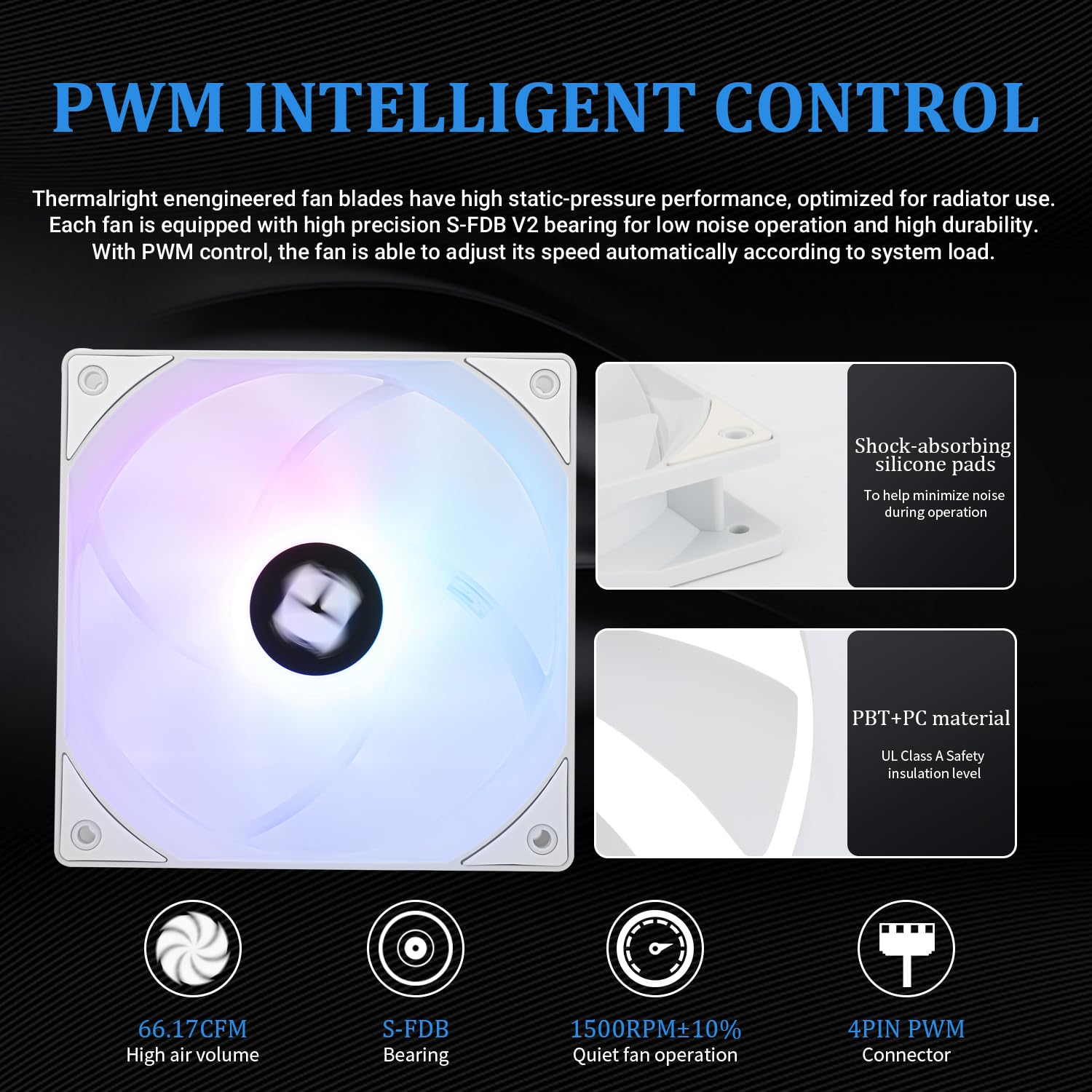 - 【Fan Parameters】Equipped with 3 fans TL-C12B-S V2 fan, Speed:1500RPM±10%, size: 120*120*25mm, noise≤23dBA, power supply interface: 4PIN PWM, light interface: 5V/3PIN ARGB, airflow: 66.17CFM(MAX), with PWM and ARGB function, can automatically adjust the speed according to the CPU temperature, provide strong airflow and lower noise, ARGB light colour can be manually adjusted. With PWM function, the speed can be adjusted automatically according to the CPU temperature, providing strong airflow.
