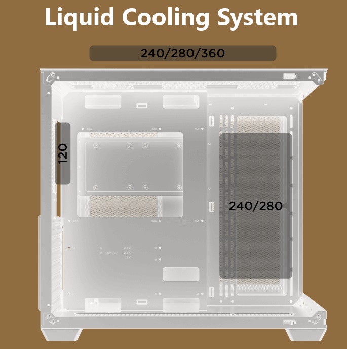 - Top: Supports 240mm, 280mm, or 360mm radiators