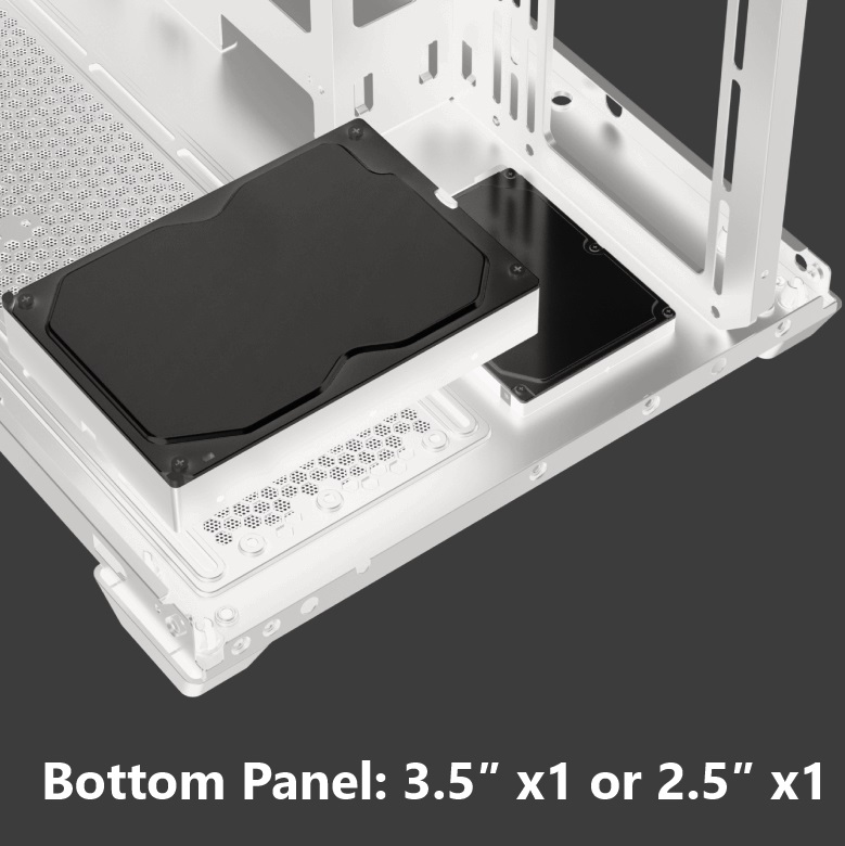- Bottom Panel: 1x 3.5″ or 1x 2.5″