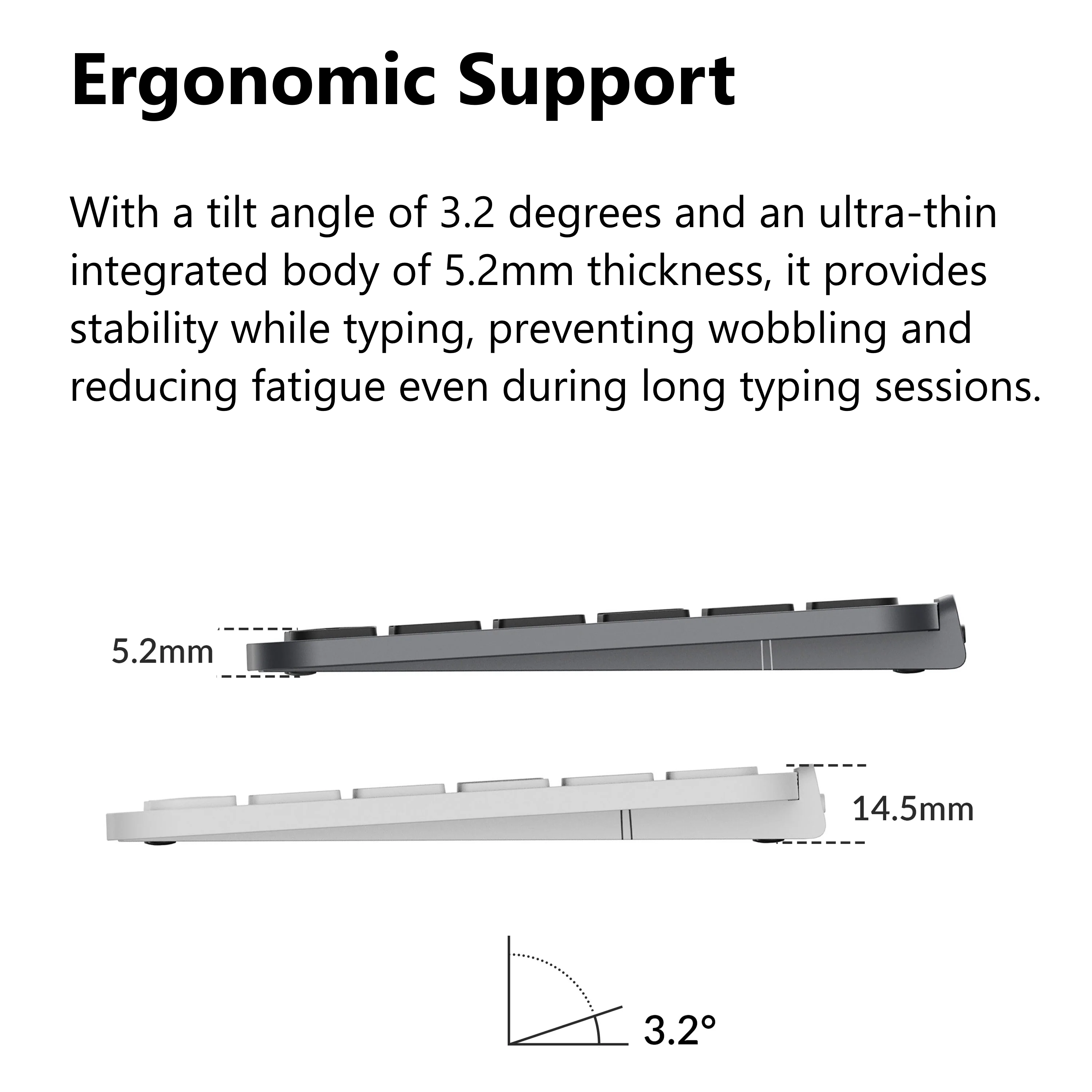 - Ergonomic Support: The keyboard features a tilt angle of 3.2 degrees and an ultra-thin profile of 5.2mm, offering stability and comfort during extended typing sessions.