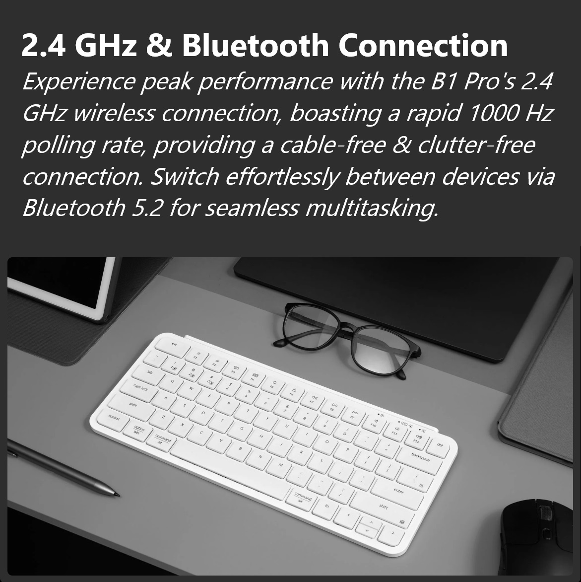 - Ultra-Portable Design: The B1 Pro is a lightweight, ultra-portable wireless keyboard that supports 2.4GHz, Bluetooth, and wired connections, ensuring versatility in your work environment.