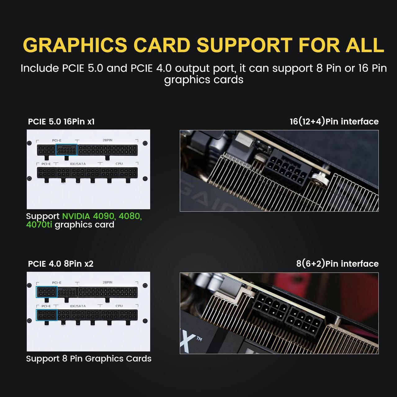 - [ATX 3.1 & PCIe 5.0 Ready] The PSU can hold up to 200% total power excursion & 300% GPU power excursion. This power supply comes with 12+4PIN PCIe 5.0 port and dual Regular 6+2PIN PCIe ports for different Graphics cards.