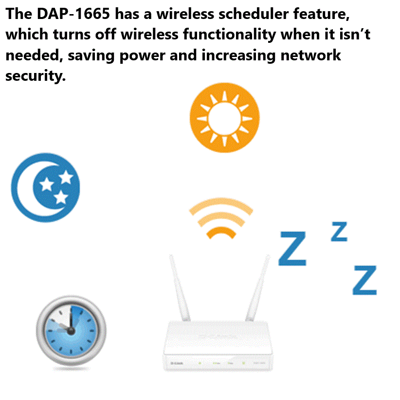 - Wireless scheduler feature turns off wireless functionality when not needed, saving power and increasing network security