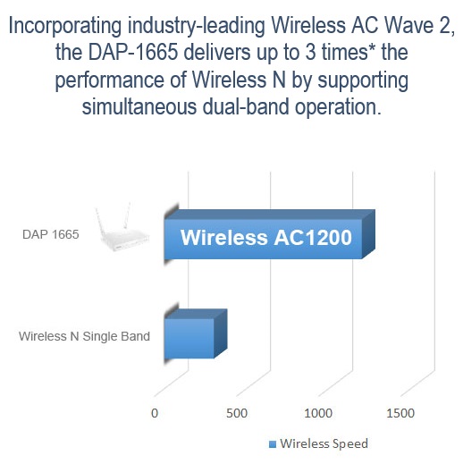 D-Link DAP-1665 Wireless AC1200 Wave 2 Dual-Band Access Point ; 300 Mbps (2.4 GHz) and 867 Mbps (5 GHz) Wireless speed ; 2 Detachable Omni-directional Antennas 3 dBi to 5 dBi Gain ; ccess Point (AP), WDS bridge, WDS with AP, wireless client