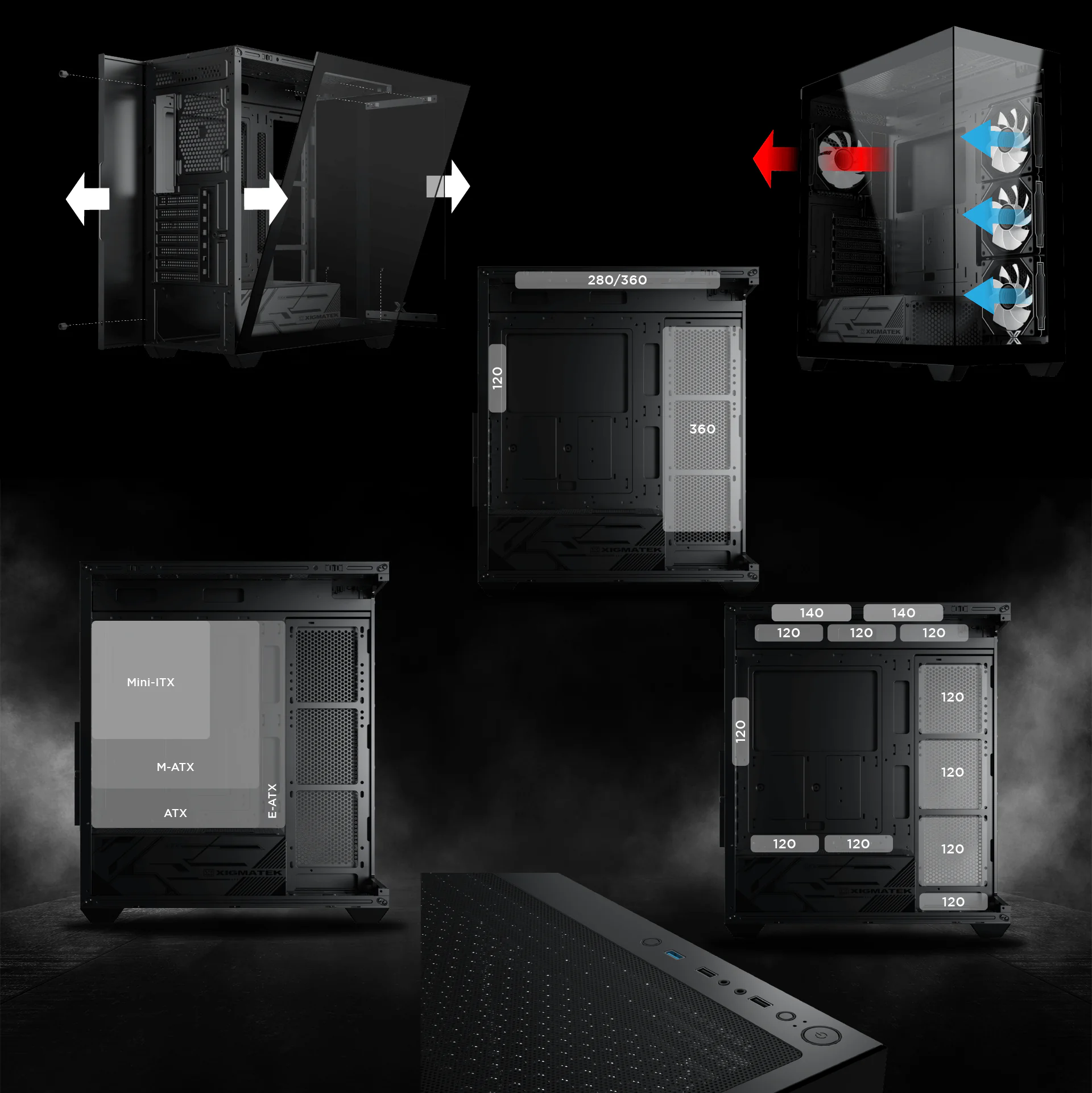 - Airflow Optimization: Supports up to 10 case fans, with four ARGB fans pre-installed—3 reverse blades on the motherboard panel side and 1 traditional on the rear.