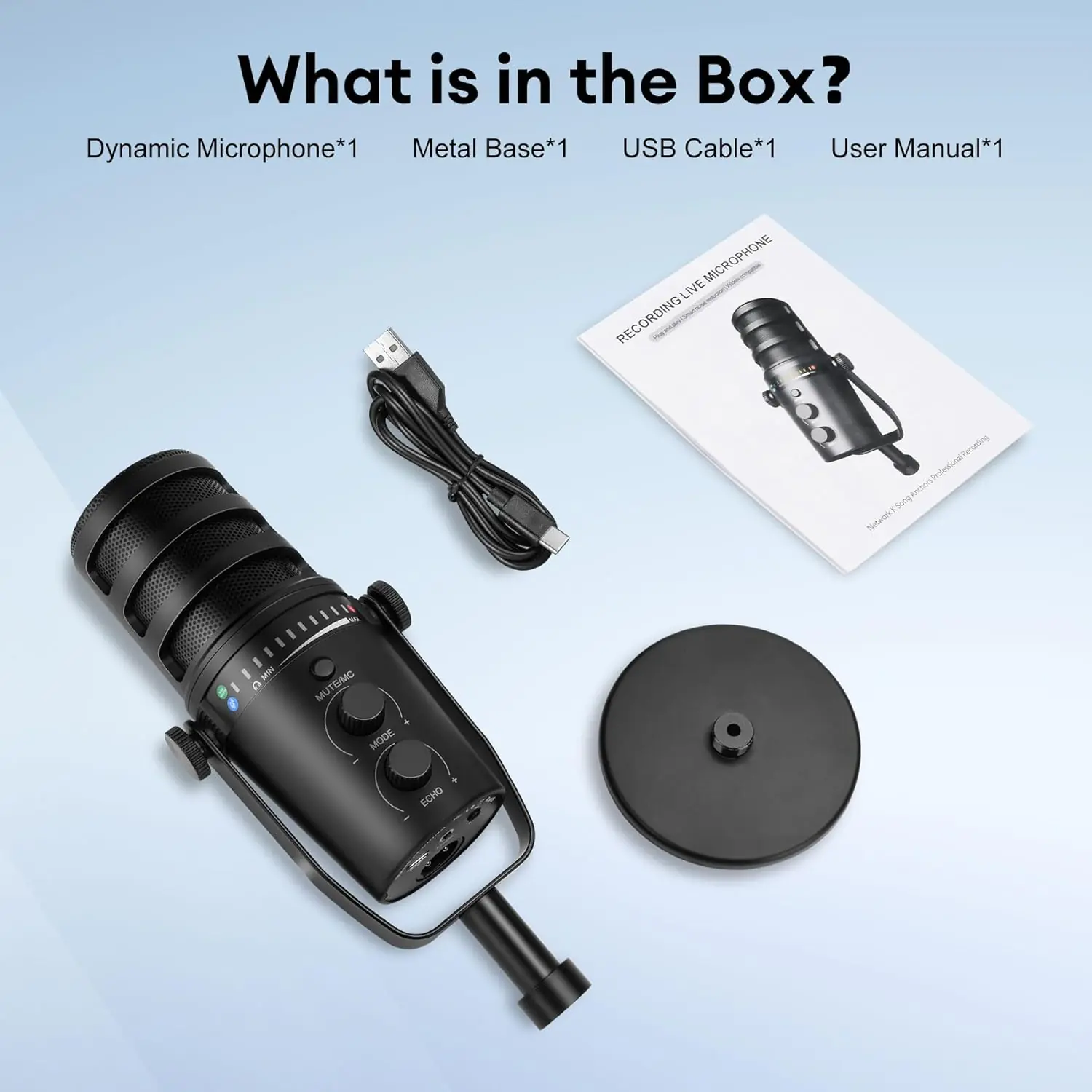 - [Package List ] What you get : Dynamic microphone*1,Heavy round metal base*1,USB cable*1,User manual*1. dynamic microphone